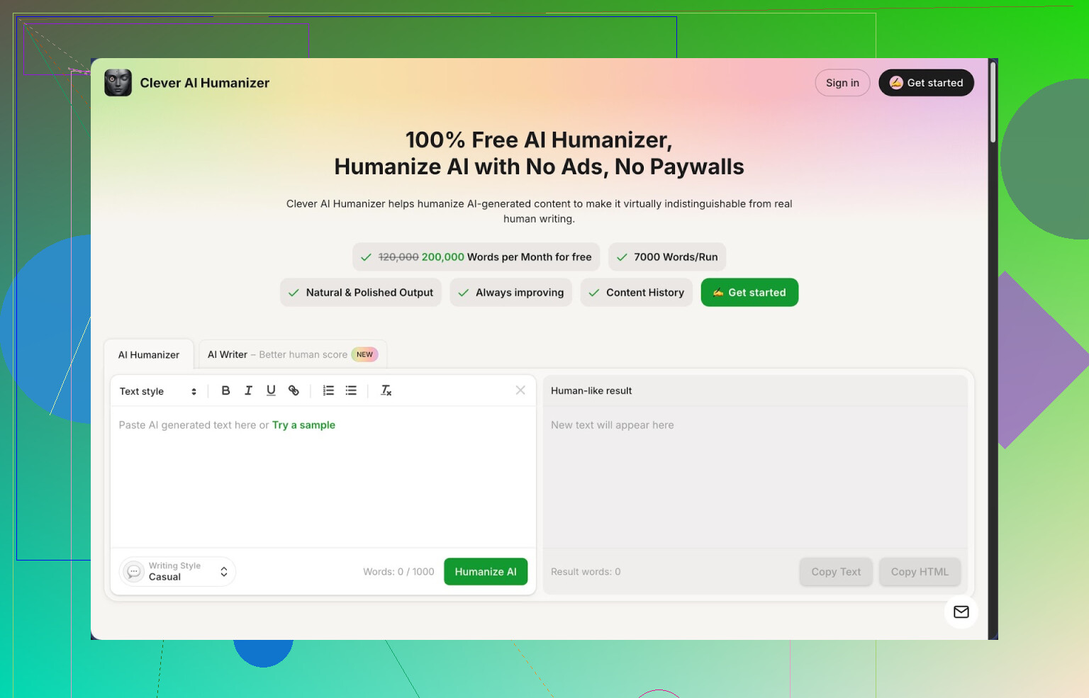 I threw several long AI chunks at it and then checked the results on ZeroGPT. Using the Casual style, all three samples showed 0% AI on ZeroGPT. That is not a guarantee for every text or every detector, but those were clean runs for me.