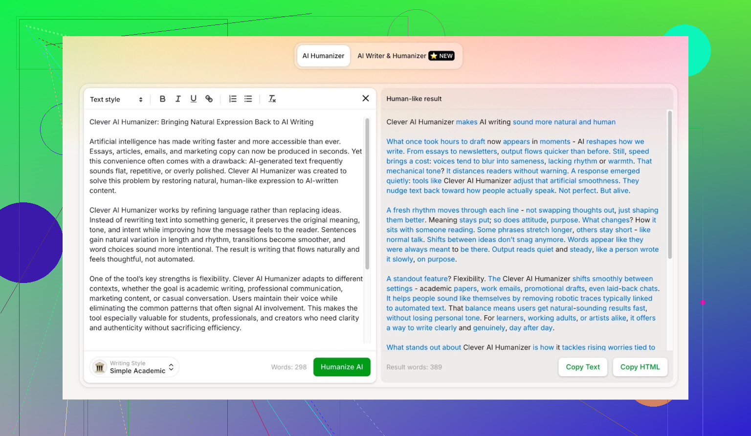 Brugt sådan er Clever AI Humanizer et poleringsfilter, ikke en ghostwriter.