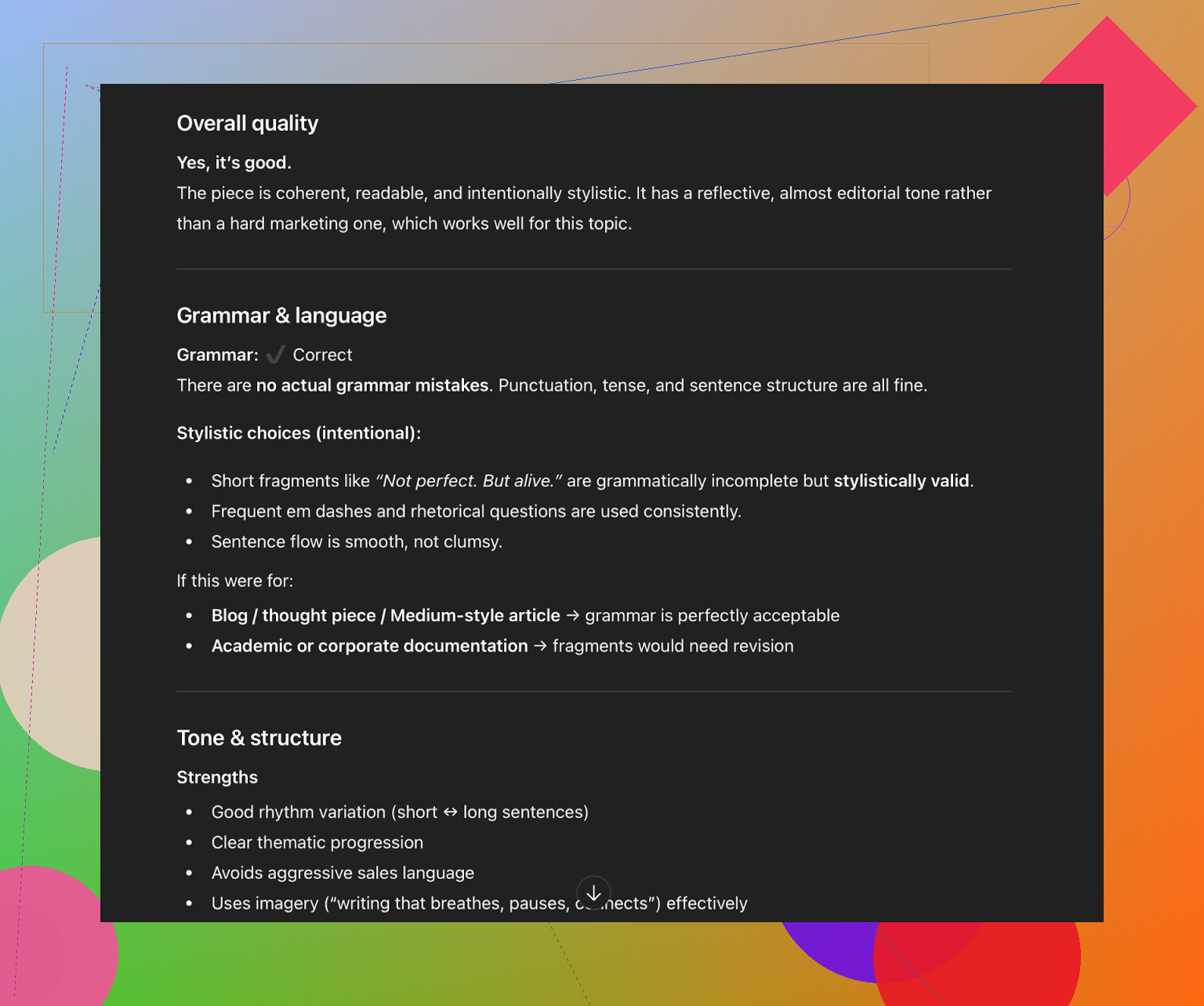 - Strukturslip: overskrifter og underoverskrifter mister fokus, fordi værktøjet omskriver dem til at være “pænere” i stedet for skarpere.