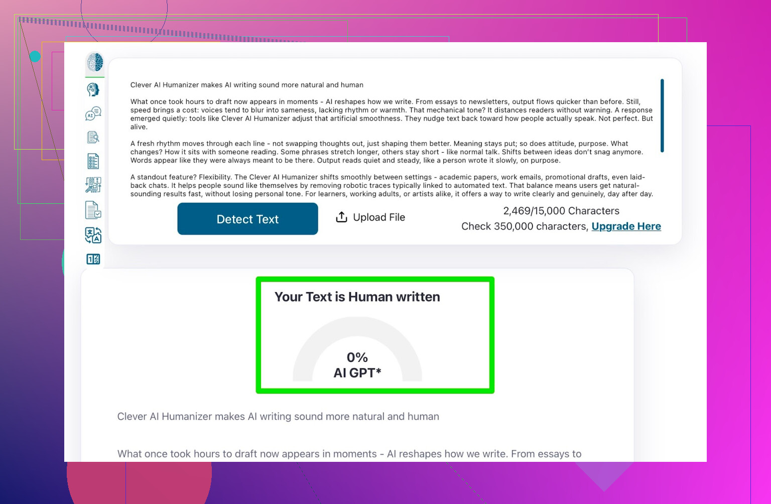 Til denne test klarede Clever AI Humanizer altså de to største detektorer uden problemer.