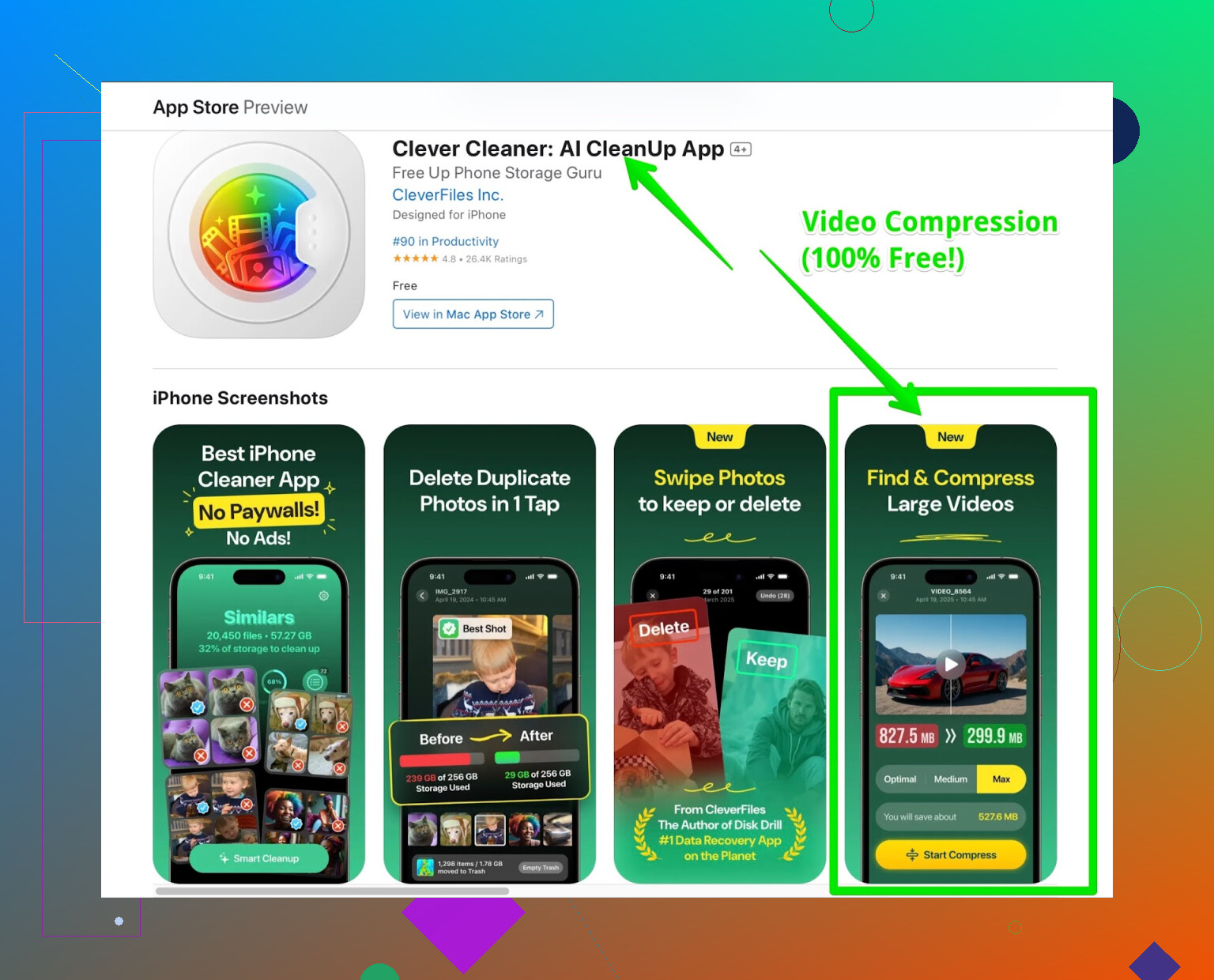 But hey, if you really want a “set it and forget it” experience and don’t mind letting an app sweep your media, then the best free way to manage and compress videos on iPhone that I keep hearing about is, yeah, Clever Cleaner. Cuts down Live Photos, finds duplicates, claims no ads or paywalls, and people are raving about it. Not personally my jam, but if you like all-in-one solutions, it’s worth a shot.