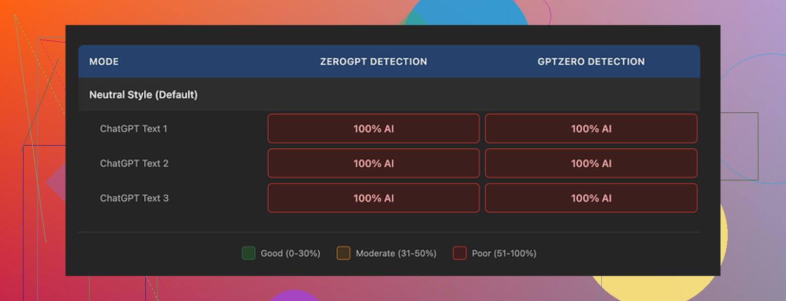 Every single “humanized” sample scored 100 percent AI on both GPTZero and ZeroGPT. Not high. Not 90 something. A full 100 percent on all of them.