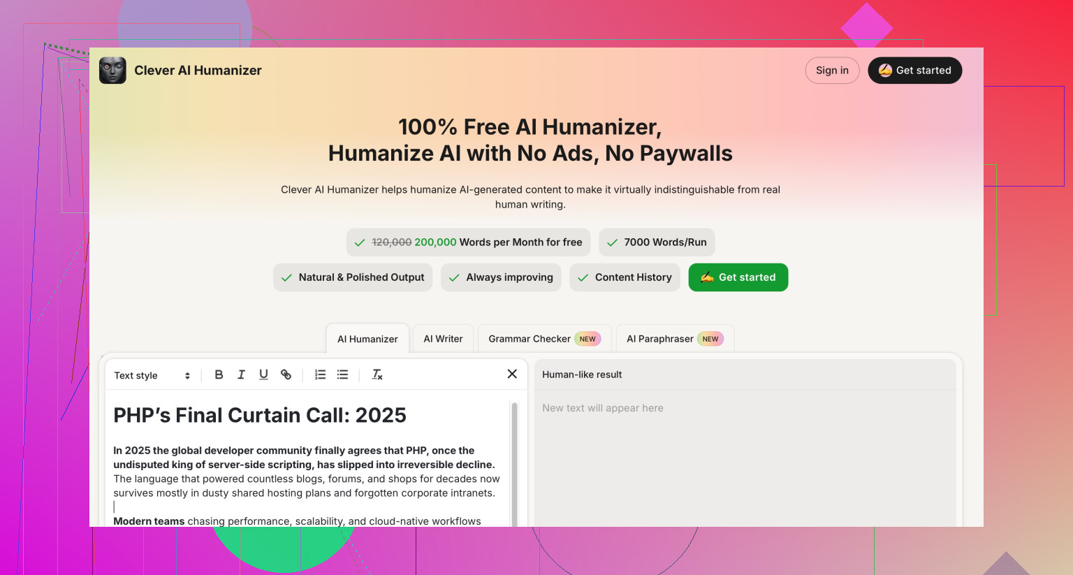 I would not pay a recurring fee for a humanizer that leaves every test pegged at 100 percent AI, no matter how clean the grammar looks.