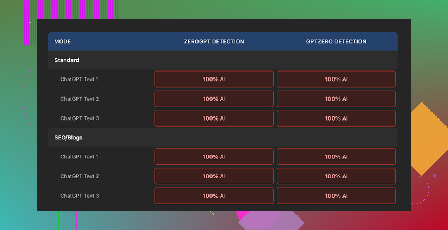 Every single sample came back as 100% AI on both detectors. Not “highly likely”, not “mixed”. Full AI flags, every time.