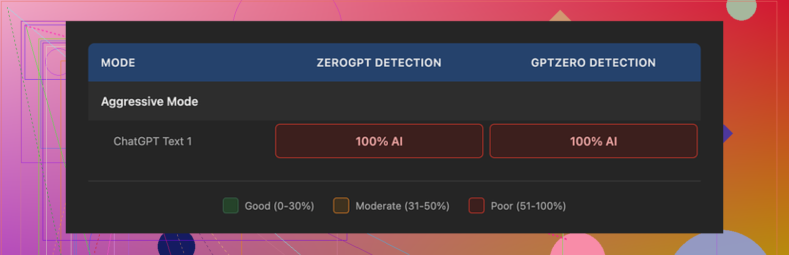 I used their Aggressive strength option, which they present as the best choice for bypassing detection. It did nothing for detection in my run. Same verdict from the detectors.