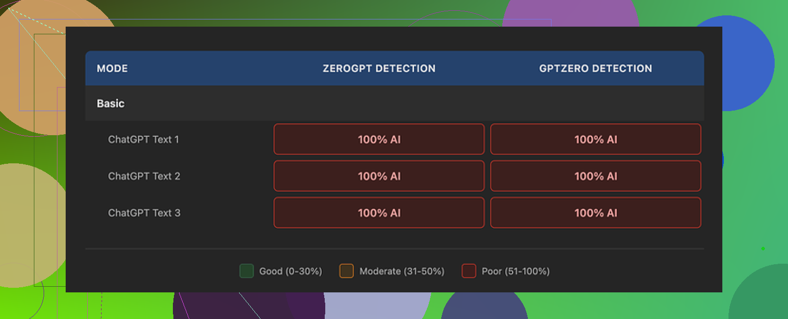• Basic mode mainly swaps synonyms and tweaks phrasing. Little impact on AI detection.